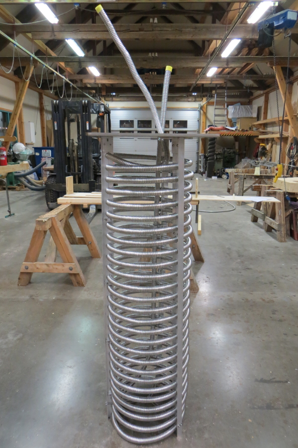 Nå gjenstår bare å lage spiralen til bruksvannet, som henger inn i tanken. Dette tok nesten vettet fra oss. To lange, lange kvelder, men til slutt ble det bra!